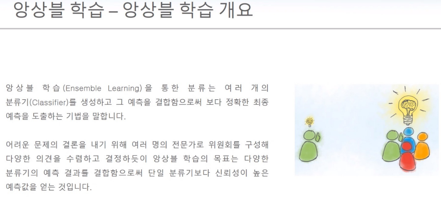from sklearn.datasets import load_iris # iris 데이터 로드 사이킥런 안에 있는 데이터 from sklearn.tree import DecisionTreeClassifier # 의사결정나무 분류기 from sklearn.model_selection import train_test_split # 학습,테스트 데이터 분리 - 변수 = load_iris() : 사이킷런에 있는 iris 데이터를 사용 하기 위해서는 객체를 만들어줘야 한다 - 변수 = iris.data : 피쳐(내용) 데이터를 가져온다 - 변수 = iris.target : 레이블(결정값) 데이터를 가져온다 - iris.target_names : iris 리이블 명을 가져온다 - DataFrame으로 변환하면 보기..