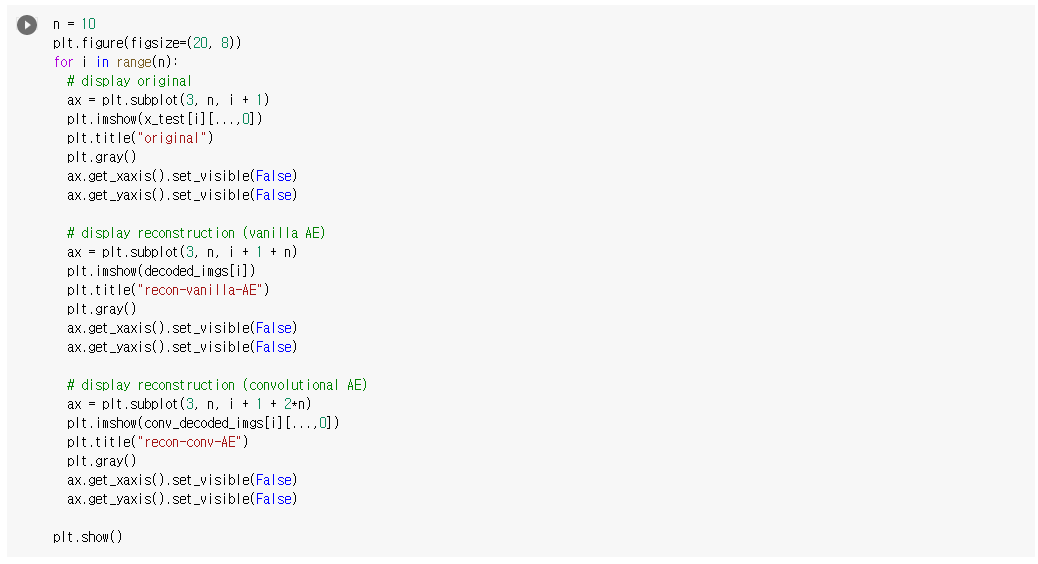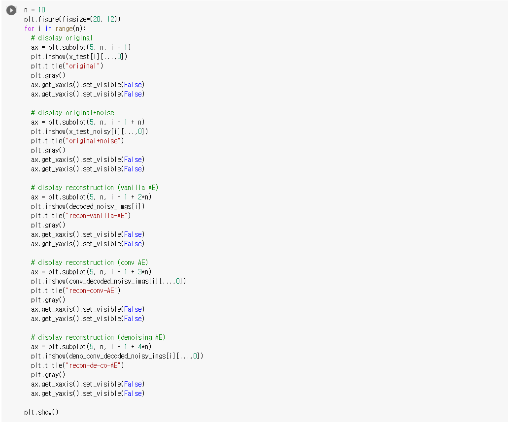 딥러닝 기초 [2021.06.29]/7일차 딥러닝 - 오토인코더 실습 코드 영성 2021. 7. 8. 17:02 Image(url='https://img1.daumcdn.net/thumb/R1280x0/?scode=mtistory2&fname=https%3A%2F%2Fblog.kakaocdn.net%2Fdna%2Fyc4QD%2Fbtq0ZLH3kgB%2FAAAAAAAAAAAAAAAAAAAAAN3jMM3AuRG-QL1NJ99ryAsb0bPqCmqlIIWpglAYCczk%2Fimg.png%3Fcredential%3DyqXZFxpELC7KVnFOS48ylbz2pIh7yKj8%26expires%3D1769871599%26allow_ip%3D%26allow_referer%3D%26signature%3DuwH3uY7k6vMDLaX2aipwm58rkK8%253D', width=600) 저작자표시 (새창열림)