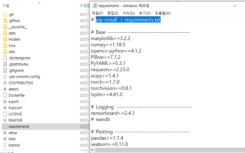 !주의 : 라이브러리는 yolov5와 나의 가상환경 설정에 따라 보이는 것과 버전은 다를 수도 있습니다